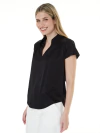 Blusa confeccionada en seda tramada asargada, de calce recto y largo a la altura de la cadera con ruedo redondeado que aporta suavidad a la silueta. Presenta hombros caídos hacia adelante con pequeños frunces que generan un detalle delicado y femenino. El escote cuenta con cuello camisero que culmina en una forma en V, aportando elegancia y versatilidad.