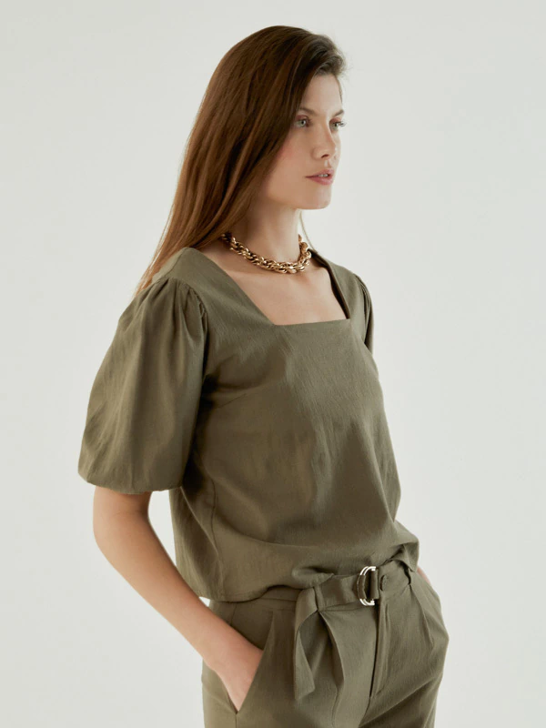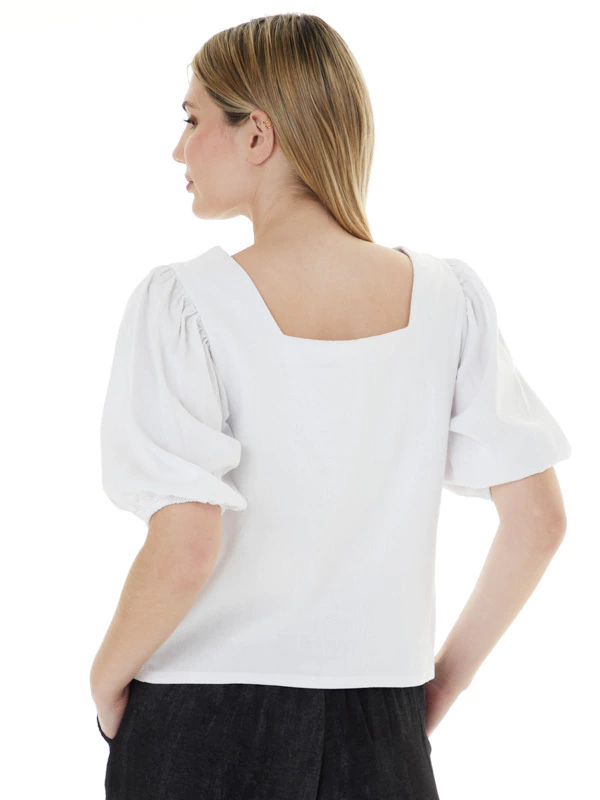 Blusa confeccionada en lino liso, con escote cuadrado tanto en delantera como en espalda. Las mangas, con largo por encima del codo, presentan frunces en los hombros y terminación con puño elastizado que genera un delicado efecto bombé. El calce es holgado, levemente evasé, y el largo llega a la primera cadera. Cuenta con corpiño interno para mayor estructura y confort.