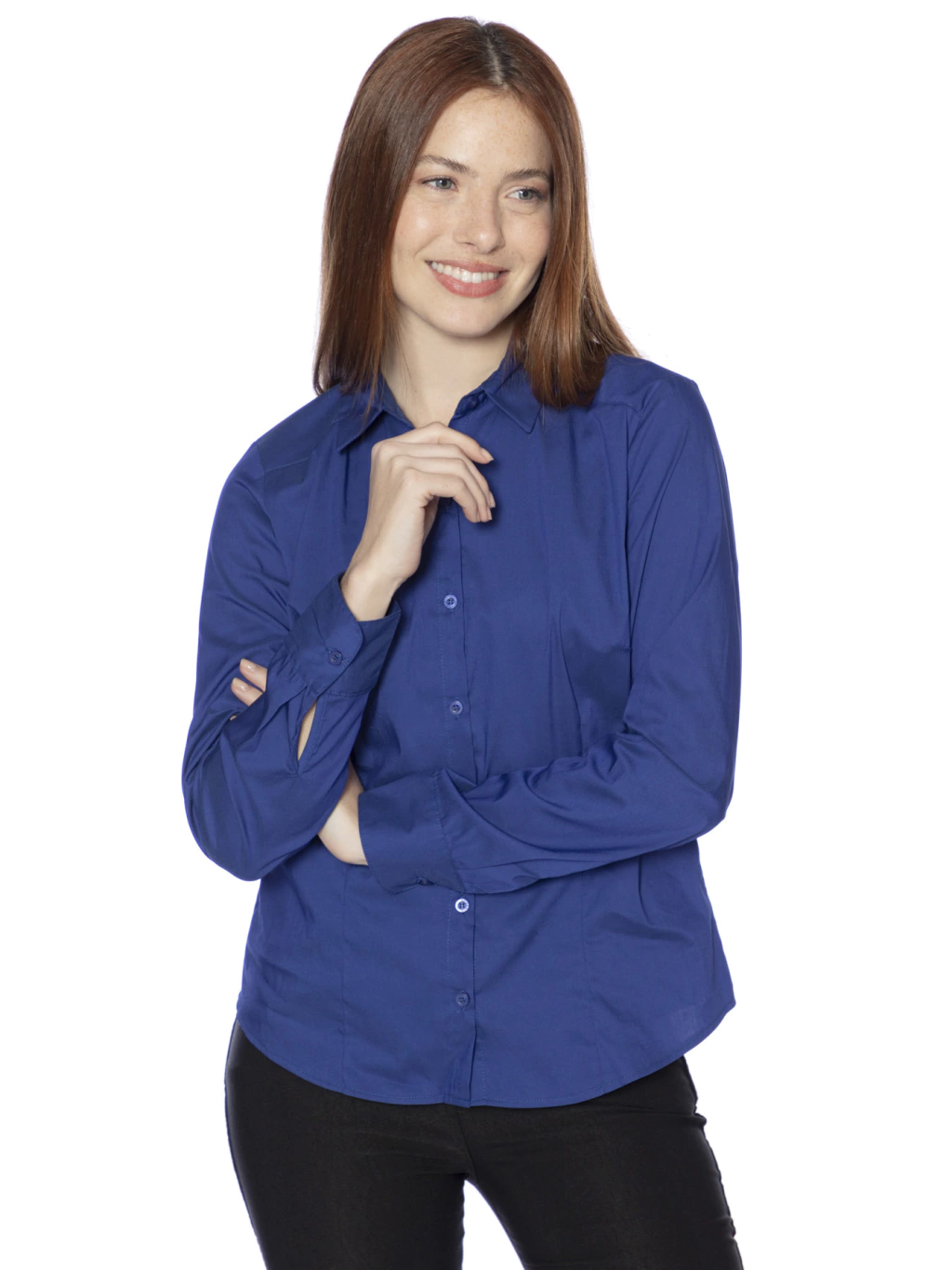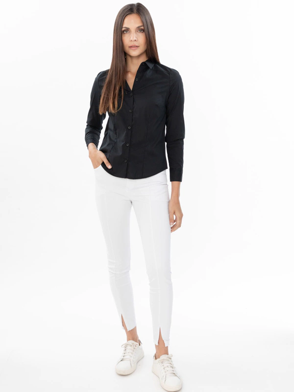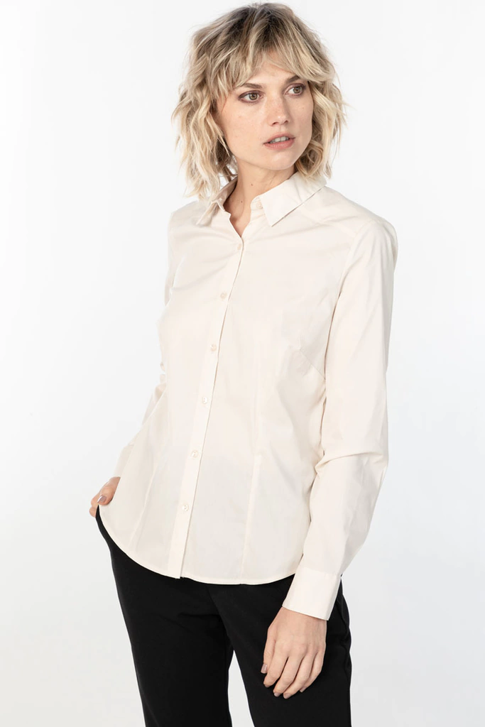 Esta camisa está confeccionada en poplín de algodón, un tejido suave y ligero que proporciona comodidad y transpirabilidad. Su calce es semi-entallado, lo que significa que se ajusta ligeramente al cuerpo para una silueta favorecedora, logrado mediante doble pinza en el delantero.