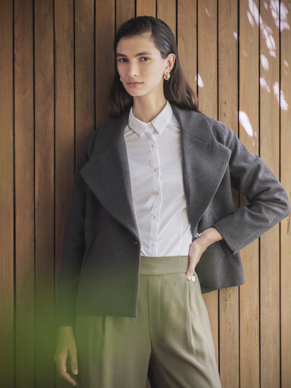 Con un largo que llega por encima de la cadera, esta camisa presenta un ruedo redondeado que añade un toque de estilo y permite un mayor movimiento. Además, el diseño del hombro se inclina hacia adelante, lo que agrega un aspecto moderno y dinámico a la prenda.