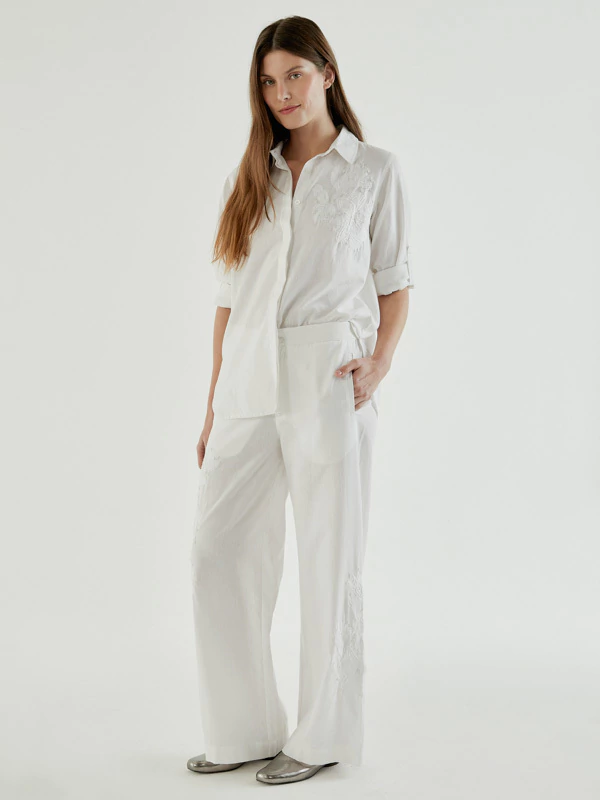Destaca por su delicado bordado floral en el extremo superior izquierdo, realizado con hilo al tono y detalles de canutillos aplicados a mano, que le dan un toque artesanal y sofisticado. En la espalda, lleva tablas encontradas que aportan amplitud y movimiento.