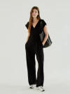 Mono confeccionado en tramado liviano de viscosa con elastano liso, que combina frescura y elasticidad para máxima comodidad. Presenta top con escote en V y sisas con recorte que aportan estilo y detalle. La cintura cuenta con elástico interno para un ajuste cómodo y práctico. El pantalón de pierna recta incluye bolsillos diagonales en el delantero, sumando funcionalidad al diseño.