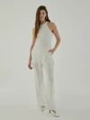 Mono palazzo con top halter confeccionado en sastrero fluido con elastano, que combina elegancia y comodidad. Cuenta con bolsillos laterales prácticos, cierre lateral y dos botones ocultos en el escote trasero que forman una delicada gota en la espalda. El color marfil viene forrado en la zona de la cadera para mayor confort y calidad. Además, tiene tablones superpuestos en los dobladillos que brindan más movimiento al caminar, aportando fluidez y estilo.