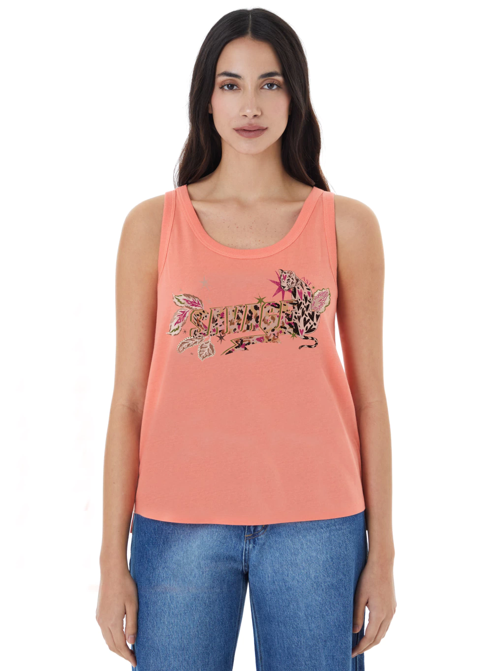 Musculosa confeccionada en jersey de algodón, de calce recto y largo por encima de la cadera. Presenta escote redondo tanto en delantera como en espalda, con terminaciones en ribb al tono que aportan definición y un acabado prolijo. Lleva una estampa central exclusiva que suma identidad y estilo a la prenda.