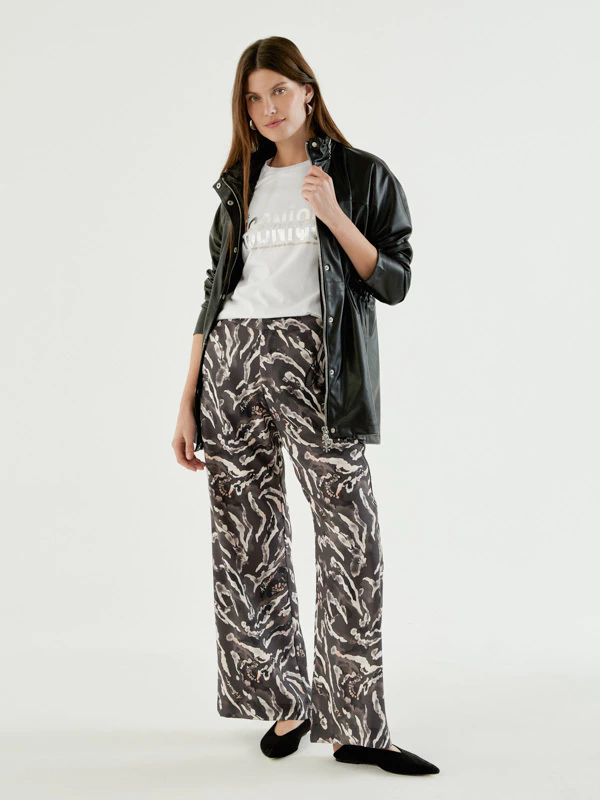 Pantalón confeccionado en sastrero ultraliviano con estampa exclusiva que aporta personalidad y un toque distintivo al look. De tiro alto y pierna ancha, con largo por debajo de los tobillos, combina estructura con fluidez para un calce favorecedor. Presenta acceso con cierre y botón, cintura con elástico en la espalda para mayor comodidad y bolsillos en diagonal en el delantero.