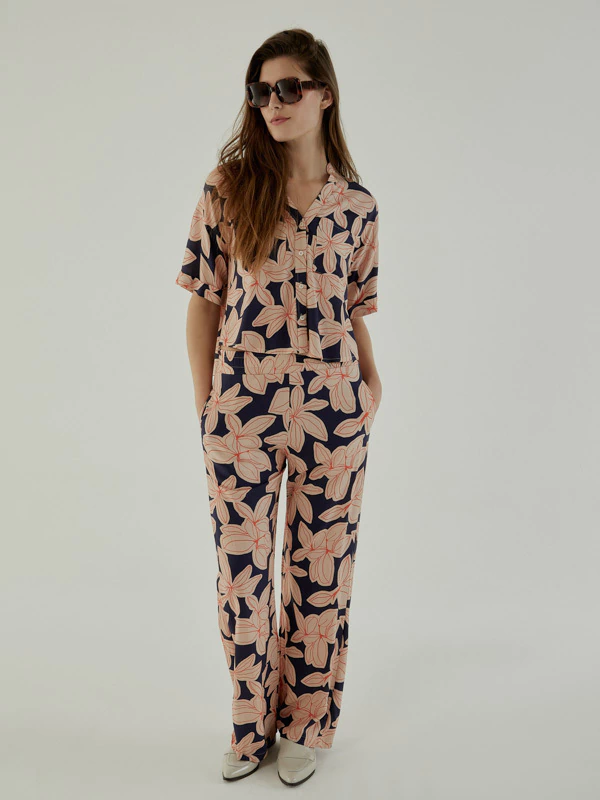Pantalón confeccionado en fibrana con estampa exclusiva, de pierna ancha y largo por debajo de los tobillos para una silueta elegante y cómoda. Cuenta con cintura con elástico que brinda ajuste flexible y bolsillos laterales funcionales.