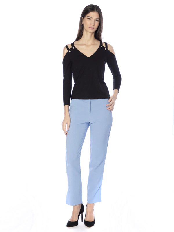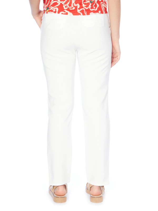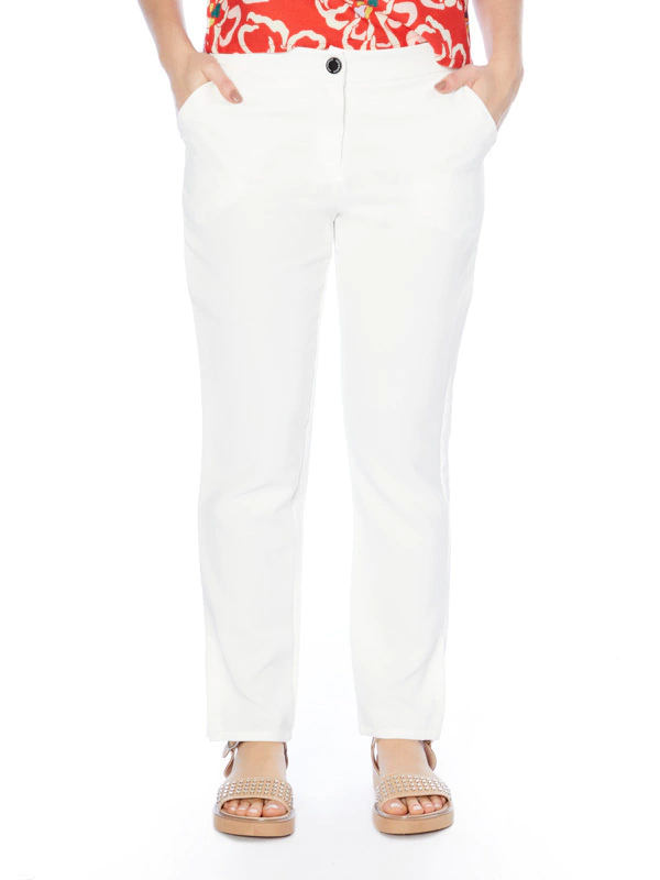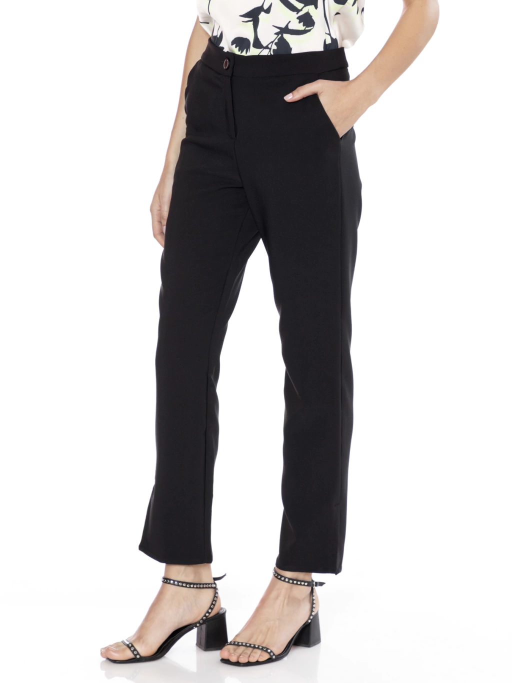 Este pantalón ofrece un ajuste cómodo gracias a su tejido elástico, perfecto para un look elegante pero relajado. La cintura presenta un diseño con cruce interno y una terminación detallada con vivo de raso, aportando un toque sofisticado. En el frente, se destacan las costuras laterales y un bolsillo diagonal práctico y funcional. Además, el ruedo cuenta con tajos superpuestos que añaden un detalle moderno y dinámico. Una prenda versátil ideal para diversas ocasiones.