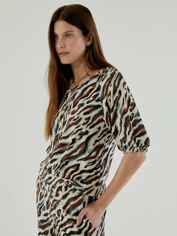 Remera confeccionada con escote bote y leves frunces en la zona de los hombros que aportan un detalle femenino y delicado. Las mangas raglán son cortas y cuentan con puños elásticos que generan un efecto fruncido, sumando textura y movimiento. Tiene calce recto en el cuerpo y largo por debajo de la cintura para un estilo cómodo y actual.
