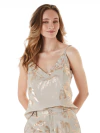 Top confeccionado en sastrero fluido con acabado foil que aporta un sutil brillo. De calce recto y largo por debajo de la cintura, tiene breteles finos con reguladores niquel para un ajuste personalizado. El escote en V está formado por una vista ancha que se cruza generando un detalle visual delicado y femenino.