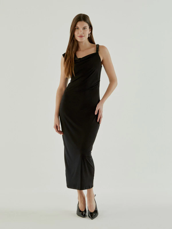 Vestido largo confeccionado en microfibra con elastano, de escote buche y diseño asimétrico en hombros. Un lado presenta manga que cubre el hombro, mientras que el otro luce un bretel formado por un cinturón fino con hebilla niquel. De fit semi ajustado, con leves frunces a la altura de la cintura baja, y largo a los tobillos.
