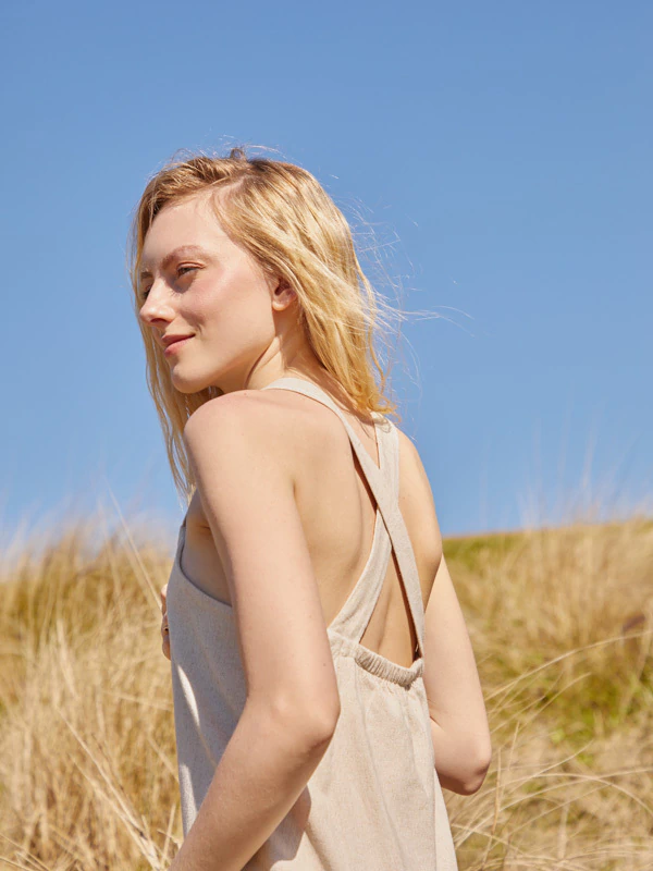 Vestido estilo solero confeccionado en lino liso, con breteles anchos y escote cuadrado que aporta un look fresco y moderno. En la espalda, los breteles se cruzan hasta la línea del escote medio y cuentan con un elástico que mejora el calce y la comodidad. La falda trasera presenta un recorte central que aporta detalle y movimiento.