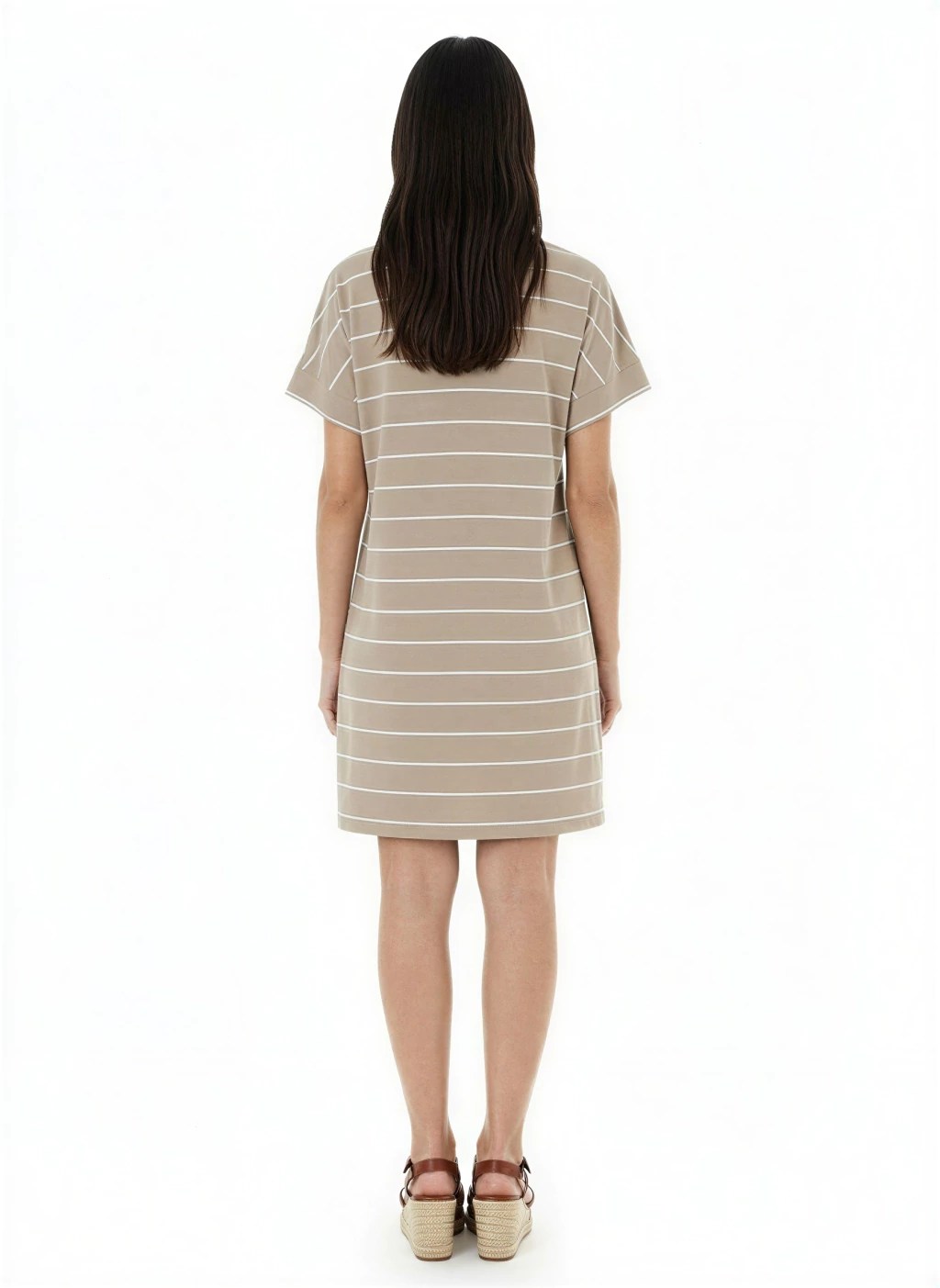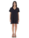 Vestido confeccionado en algodón con elastano rayado, de corte recto y calce holgado para máxima comodidad. Presenta escote en V con vistas anchas que resaltan el diseño, y mangas caídas con vivo ancho que aportan un toque moderno y relajado. El largo es por encima de las rodillas e incluye dos tajos laterales que facilitan el movimiento.